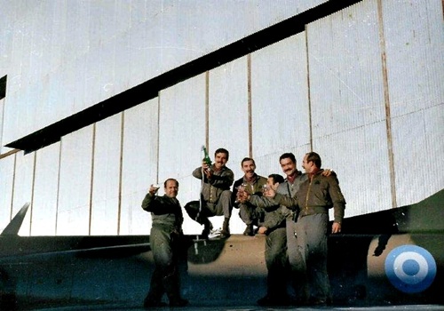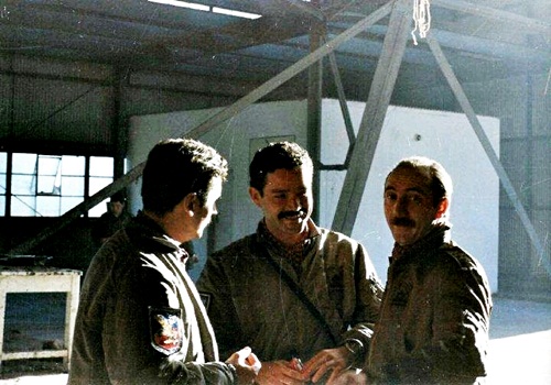 Esta foto tiene casi 30 años y pertenece a la ceremonia de Vuelo Solo en el año 1980. El que esta a la izquierda mirando para otro lado, es Héctor Ricardo Volponi, quien falleciera el 23 de Mayo de 1982 a bordo del Dagger C-437. El del medio es Gustavo Aguirre Faget, hoy encargado del INAC en Moron y el que le sigue mirando a la camara es Juan Domingo Bernhardt, fallecido el 29 de Mayo de 1982 a bordo del Dagger C-436.