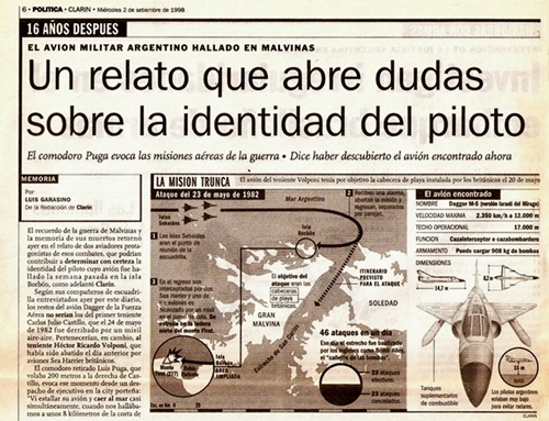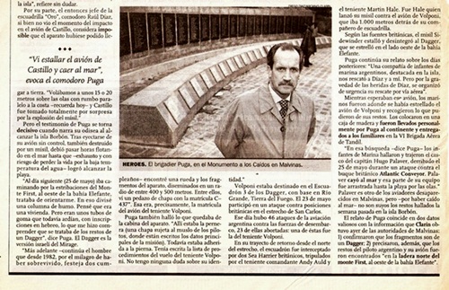 El hoy Comodoro Luis Puga, tras eyectarse de su avión sin control, también destruido por un misil, debió pasar horas flotando en el mar hasta que -exhausto y con riesgo de perder la vida por la baja temperatura del agua- logró alcanzar la playa. Al día siguiente (25 de mayo) iba caminando por la estribaciones del Monte First, al oeste de la bahía Elefante, trataba de orientarme. En eso divisé una columna de humo. Pensé que era una vivienda. Pero eran unos tubos de goma que todavía ardían, con inscripciones en hebreo, lo que me hizo comprender que se trataba de los restos de un Dagger, dice Puga. Más adelante -continúa el hombre que desde 1982, por el milagro de haber sobrevivido, festeja dos cumpleaños- encontré una rueda y los fragmentos del aparato, diseminados en un radio de entre 400 y 500 metros. Entre ellos, vi un pedazo de chapa con la matrícula C-437. Esa era, precisamente, la matrícula del avión del teniente Volponi. Puga también halló lo que quedaba de la cabina del aparato. Allí estaba la pernera (una chapa sujeta al muslo de los pilotos, donde están escritos los datos principales de la misión). Todavía estaba adherida a la pierna. Tenía escrita la lista de procedimientos del vuelo del teniente Volponi.